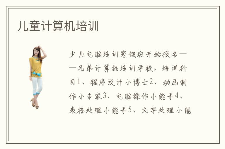 少兒電腦培訓寒假班開始報名——兄弟計算機培訓學校,培訓科目1、程序設計小博士2、動畫制作小專家3、電腦操作小能手4、表格處理小能手5、文字處理小能手6、圖像處理
