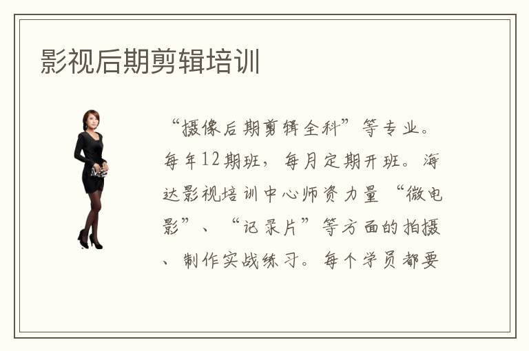 “攝像后期剪輯全科”等專業(yè)。每年12期班,每月定期開(kāi)班。海達(dá)影視培訓(xùn)中心師資力量 “微電影”、“記錄片”等方面的拍攝、制作實(shí)戰(zhàn)練習(xí)。每個(gè)學(xué)員都要由老師輔導(dǎo)獨(dú)立完
