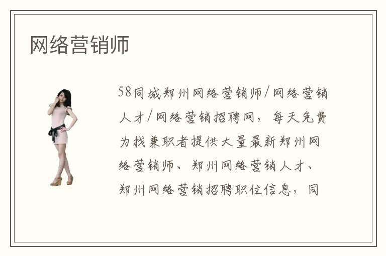 58同城鄭州網(wǎng)絡(luò)營銷師/網(wǎng)絡(luò)營銷人才/網(wǎng)絡(luò)營銷招聘網(wǎng),每天免費為找兼職者提供大量最新鄭州網(wǎng)絡(luò)營銷師、鄭州網(wǎng)絡(luò)營銷人才、鄭州網(wǎng)絡(luò)營銷招聘職位信息,同時為企業(yè)提供