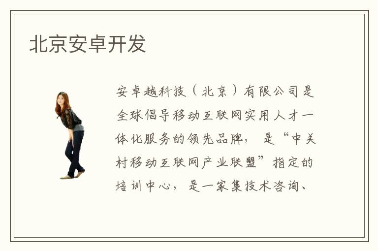 安卓越科技(北京)有限公司是全球倡導移動互聯(lián)網實用人才一體化服務的領先品牌, 是“中關村移動互聯(lián)網產業(yè)聯(lián)盟”指定的培訓中心,是一家集技術咨詢、技術開發(fā)、人才