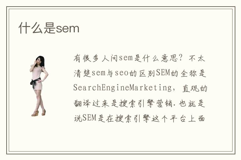 有很多人問sem是什么意思?不太清楚sem與seo的區(qū)別SEM的全稱是SearchEngineMarketing,直觀的翻譯過來是搜索引擎營銷.也就是說SEM是在搜索引擎這個平臺上面進(jìn)行營銷