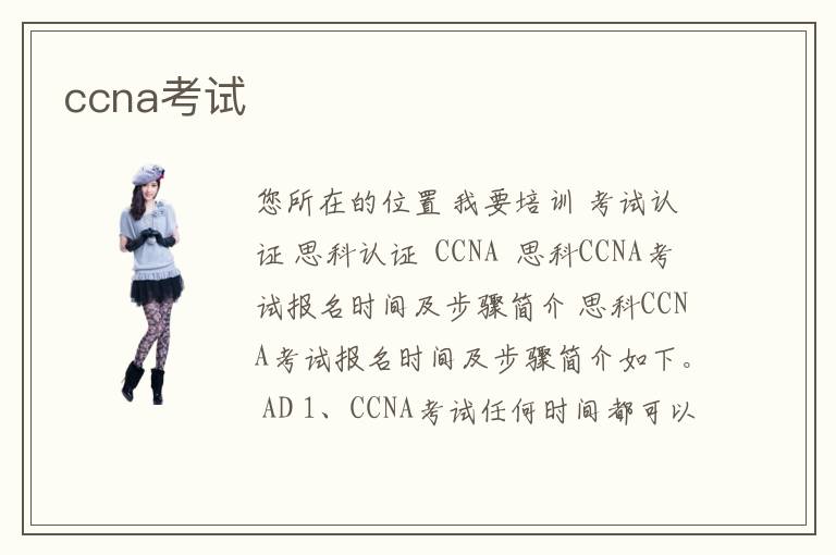 您所在的位置 我要培訓(xùn) >考試認(rèn)證 >思科認(rèn)證 > CCNA > 思科CCNA考試報名時間及步驟簡介 思科CCNA考試報名時間及步驟簡介如下。 AD 1、CCNA考試任何時間都可以報名