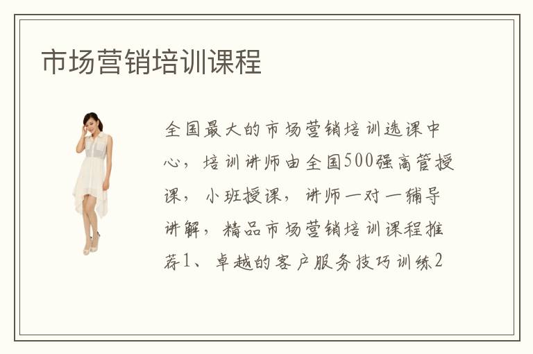 全國最大的市場營銷培訓選課中心,培訓講師由全國500強高管授課,小班授課,講師一對一輔導講解,精品市場營銷培訓課程推薦1、卓越的客戶服務技巧訓練2、出口營銷技巧