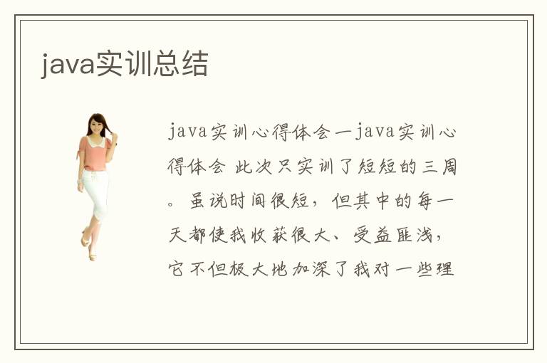 總結(jié)一 java實(shí)訓(xùn)個(gè)人總結(jié) 短短的一個(gè)月很快就過去了,在這短短的一個(gè)月里,我學(xué)到了很多,了解了很多。在這一個(gè)月里我學(xué)到了有關(guān)JAVA等方面的知識(shí),了解了關(guān)于軟件開發(fā)