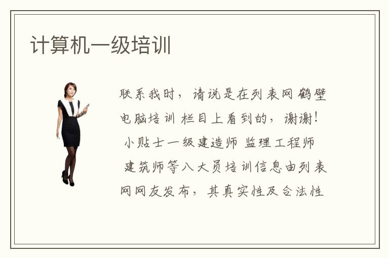 聯(lián)系我時,請說是在列表網(wǎng) 鶴壁電腦培訓(xùn) 欄目上看到的,謝謝! 小貼士一級建造師 監(jiān)理工程師 建筑師等八大員培訓(xùn)信息由列表網(wǎng)網(wǎng)友發(fā)布,其真實(shí)性及合法性由發(fā)布人負(fù)責(zé)。