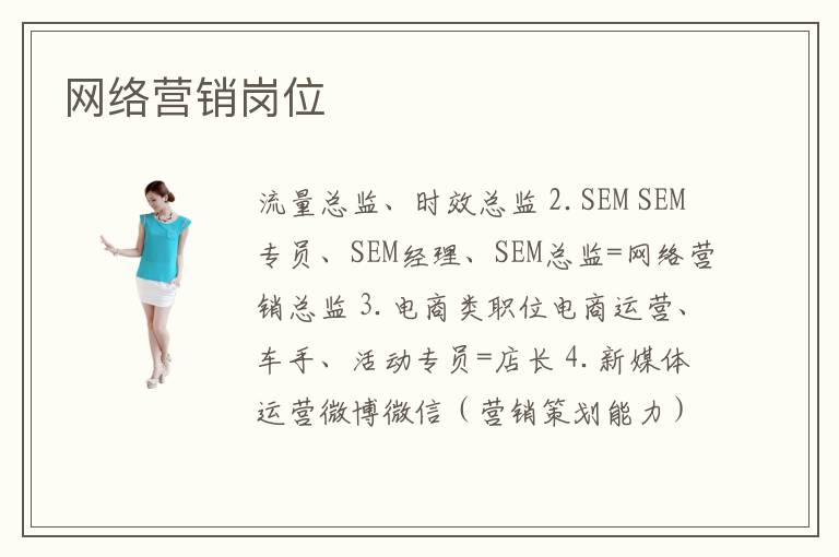 流量總監(jiān)、時(shí)效總監(jiān) 2.SEM SEM專員、SEM經(jīng)理、SEM總監(jiān)=>網(wǎng)絡(luò)營銷總監(jiān) 3.電商類職位電商運(yùn)營、車手、活動(dòng)專員=店長 4.新媒體運(yùn)營微博微信(營銷策劃能力) 5.自由創(chuàng)