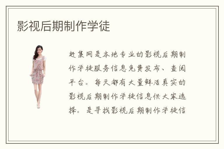 趕集網(wǎng)是本地專業(yè)的影視后期制作學(xué)徒服務(wù)信息免費(fèi)發(fā)布、查閱平臺(tái)。每天都有大量鮮活真實(shí)的影視后期制作學(xué)徒信息供大家選擇。是尋找影視后期制作學(xué)徒信息的最佳平臺(tái)。