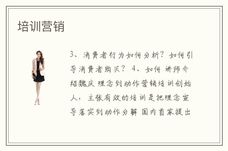 3、消費(fèi)者行為如何分析?如何引導(dǎo)消費(fèi)者購(gòu)買(mǎi)? 4、如何 講師介紹魏慶 理念到動(dòng)作營(yíng)銷(xiāo)培訓(xùn)創(chuàng)始人,主張有效的培訓(xùn)是把理念宣導(dǎo)落實(shí)到動(dòng)作分解 國(guó)內(nèi)首家提出客戶(hù)對(duì)培訓(xùn)質(zhì)