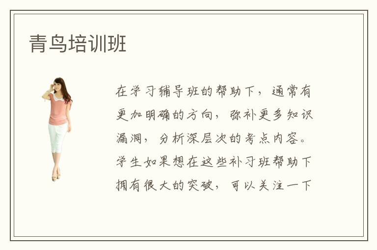 在學(xué)習(xí)輔導(dǎo)班的幫助下,通常有更加明確的方向,彌補(bǔ)更多知識(shí)漏洞,分析深層次的考點(diǎn)內(nèi)容。學(xué)生如果想在這些補(bǔ)習(xí)班幫助下?lián)碛泻艽蟮耐黄疲梢躁P(guān)注一下青鳥(niǎo)培訓(xùn)班專(zhuān)業(yè)課程以及教學(xué)方案、培訓(xùn)設(shè)施、學(xué)習(xí)成果等等。部分補(bǔ)習(xí)班的資源確實(shí)不夠多,配套設(shè)施不夠齊備,學(xué)生的應(yīng)用水準(zhǔn)不夠高,往往會(huì)對(duì)這些機(jī)構(gòu)不滿(mǎn),甚至給出負(fù)面的評(píng)價(jià),學(xué)生要謹(jǐn)慎關(guān)注。青鳥(niǎo)培訓(xùn)班多少費(fèi)用,可能在2000~6000,但事實(shí)上學(xué)生的報(bào)名課程難度不同,時(shí)間等等會(huì)變化,所以預(yù)算有差別。青鳥(niǎo)培訓(xùn)班補(bǔ)習(xí)形式相當(dāng)多樣,比如如今大家很喜歡的網(wǎng)絡(luò)培訓(xùn)方案,大家通過(guò)互聯(lián)網(wǎng)的方式,在家里利用手機(jī)或iPad、電腦等等即可上課,而且學(xué)習(xí)時(shí)間比較短,但老師講課的內(nèi)容相當(dāng)全面,基本不存在培訓(xùn)漏洞。
