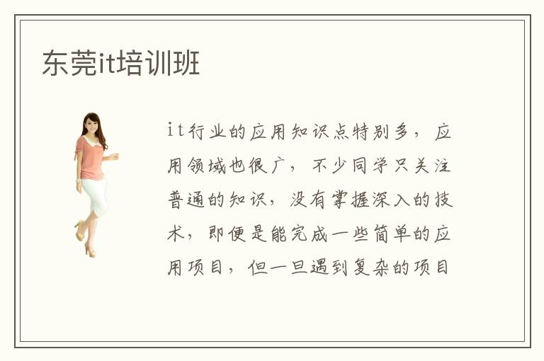 it行業(yè)的應(yīng)用知識(shí)點(diǎn)特別多,應(yīng)用領(lǐng)域也很廣,不少同學(xué)只關(guān)注普通的知識(shí),沒有掌握深入的技術(shù),即便是能完成一些簡(jiǎn)單的應(yīng)用項(xiàng)目,但一旦遇到復(fù)雜的項(xiàng)目時(shí),往往會(huì)變得很艱難。東莞it培訓(xùn)班可以進(jìn)行深入的剖析,提供大量的學(xué)習(xí)規(guī)劃,完善學(xué)生的it知識(shí)結(jié)構(gòu),使同學(xué)對(duì)it課程的理解能力更強(qiáng),應(yīng)用水平更突出。it學(xué)生要學(xué)什么課程,it輔導(dǎo)機(jī)構(gòu)的學(xué)生需要掌握大量應(yīng)用課程,包括軟件開發(fā)與設(shè)計(jì),系統(tǒng)安裝與調(diào)試,云計(jì)算技術(shù),人工智能互聯(lián)網(wǎng)等等。同學(xué)要謹(jǐn)慎學(xué)習(xí)這一些重要知識(shí),不要忽略到每一個(gè)領(lǐng)域的價(jià)值和應(yīng)用方法。it培訓(xùn)班有什么用,it輔導(dǎo)機(jī)構(gòu)的主要作用就是嚴(yán)謹(jǐn)控制時(shí)間,調(diào)動(dòng)學(xué)生的動(dòng)力和激情,促進(jìn)學(xué)生全方位的進(jìn)步,所以大家可以好好珍惜這些培訓(xùn)班的學(xué)習(xí)機(jī)會(huì)。