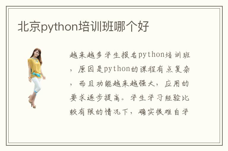越來越多學(xué)生報(bào)名python培訓(xùn)班,原因是python的課程有點(diǎn)復(fù)雜,而且功能越來越強(qiáng)大,應(yīng)用的要求逐步提高。學(xué)生學(xué)習(xí)經(jīng)驗(yàn)比較有限的情況下,確實(shí)很難自學(xué)掌握這些課程,不得不選擇python培訓(xùn)機(jī)構(gòu)的幫助。不過大家不用緊張,因?yàn)榕嘤?xùn)機(jī)構(gòu)有大量的課程,可以讓大家改善python應(yīng)用能力,解決很多應(yīng)用的難題。北京python培訓(xùn)班哪個(gè)好,學(xué)生在挑選培訓(xùn)班時(shí),應(yīng)該先分析個(gè)人需要彌補(bǔ)的課程,然后再對(duì)比不同培訓(xùn)班的教學(xué)優(yōu)勢(shì)和側(cè)重點(diǎn),這樣選擇起來就會(huì)方便很多。python專業(yè)培訓(xùn)班如何選,如果還是找不到專業(yè)的培訓(xùn)班,可以咨詢一下過來人的經(jīng)驗(yàn),看看學(xué)生的口碑。有些同學(xué)對(duì)輔導(dǎo)班的評(píng)價(jià)很高,因?yàn)閷W(xué)校會(huì)提供大量python應(yīng)用內(nèi)容,學(xué)生即可掌握基礎(chǔ)課程,又可以掌握應(yīng)用技能。