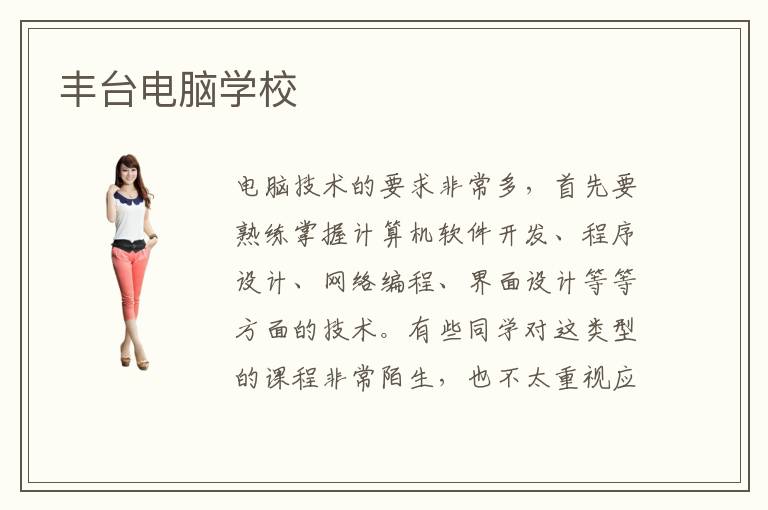 電腦技術(shù)的要求非常多,首先要熟練掌握計算機軟件開發(fā)、程序設(shè)計、網(wǎng)絡(luò)編程、界面設(shè)計等等方面的技術(shù)。有些同學(xué)對這類型的課程非常陌生,也不太重視應(yīng)用的方法,缺乏應(yīng)用的經(jīng)驗和機會,導(dǎo)致電腦技術(shù)水平非常糟糕,久而久之,還可能失去學(xué)習(xí)的信心。豐臺電腦學(xué)校非常專業(yè),對同學(xué)有很嚴(yán)謹(jǐn)?shù)囊?,只要同學(xué)對電腦科技的應(yīng)用有不懂的地方,老師會及時制定個性化的課程,使大家理解更透徹,以后就不會感覺到這些課程很難。電腦學(xué)校的課程難不難,老師會循序漸進,從簡單的電腦技術(shù)課程開始,使同學(xué)有更深入的了解,以后會慢慢增加難度,讓大家有更多緩沖的時間。電腦學(xué)校的作用就是幫助大家總結(jié)課程內(nèi)容,分析行業(yè)動態(tài),挖掘同學(xué)以前沒有接觸過的電腦知識。
