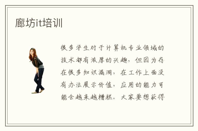 很多學生對于計算機專業(yè)領域的技術都有濃厚的興趣,但因為存在很多知識漏洞,在工作上面沒有辦法展示價值,應用的能力可能會越來越糟糕。大家要想獲得進步,一方面要多投入時間,掌握重要課程,另一方面也可以參與廊坊it培訓。這些學校的輔導水準都很高,教學成果也比較明顯,老師會制定清晰規(guī)劃,幫助學生達到每一個階段的學習目標,完成許多細節(jié)的任務。it行業(yè)就業(yè)難不難,計算機行業(yè)的就業(yè)難度不算特別高,主要原因就是整個行業(yè)的發(fā)展速度都特別快,而且發(fā)展也相當不錯,工作者的需求量大,但如果個人能力不是很強,無法完成許多工作的任務,那么就算大環(huán)境再好,跟自己也沒有絲毫的關系。it在線培訓很有用,大家要好好利用這些在線輔導的課程,加快學習進程。