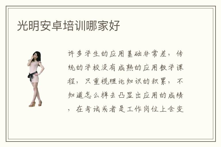 許多學(xué)生的應(yīng)用基礎(chǔ)非常差,傳統(tǒng)的學(xué)校沒有成熟的應(yīng)用教學(xué)課程,只重視理論知識的積累,不知道怎么樣去凸顯出應(yīng)用的成績,在考試或者是工作崗位上會變得非常困難。光明安卓培訓(xùn)多永劫間,一般情況下一個月到三個月就能夠?qū)崿F(xiàn)這些練習(xí)的項眼,但若是學(xué)習(xí)的結(jié)果不太好,前進的速率也很緩,時間可能就要恰當(dāng)?shù)⒄`。當(dāng)然許多學(xué)生的經(jīng)濟條件不太好,所以在安卓培訓(xùn)班報名之前,都會很重視安卓培訓(xùn)價格,如果費用太高,可能會另有選擇。市場對安卓培訓(xùn)人才的需求與日俱增,因此,我們對安卓培訓(xùn)機構(gòu)的重視程度也就越來越高了,安卓培訓(xùn)機構(gòu)培訓(xùn)水平、教育設(shè)備等都是我們需要密切關(guān)注密切了解的,安卓培訓(xùn)機構(gòu)的培訓(xùn)人員有著優(yōu)越的培訓(xùn)理念,把就業(yè)率和對專業(yè)知識的靈活運用放在教育培訓(xùn)的首位。