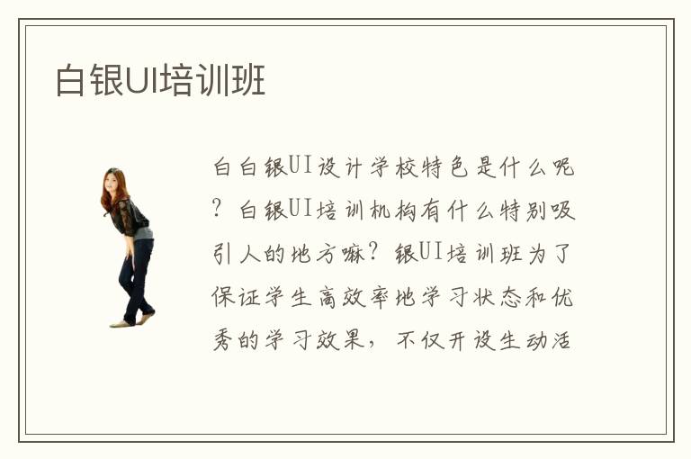 白白銀UI設(shè)計(jì)學(xué)校特色是什么呢?白銀UI培訓(xùn)機(jī)構(gòu)有什么特別吸引人的地方嘛?銀UI培訓(xùn)班為了保證學(xué)生高效率地學(xué)習(xí)狀態(tài)和優(yōu)秀的學(xué)習(xí)效果,不僅開設(shè)生動(dòng)活潑有活力的課堂模式,而且還開設(shè)了網(wǎng)絡(luò)教學(xué)模式,讓學(xué)生能夠在線上就得到知識(shí)的滋養(yǎng),學(xué)生們有疑惑的時(shí)候可以在線上提問。白銀UI培訓(xùn)機(jī)構(gòu)哪一家比較突出呢?白銀UI培訓(xùn)學(xué)校的排名是根據(jù)各學(xué)校的綜合實(shí)力評(píng)的。
