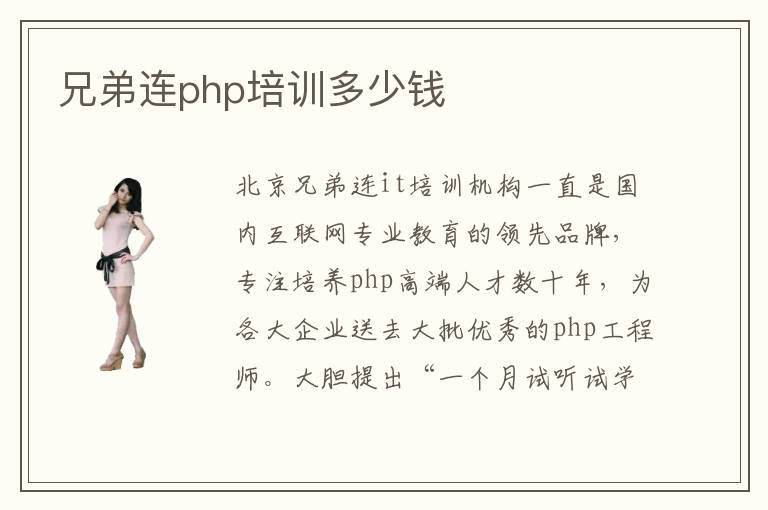 北京兄弟連it培訓(xùn)機(jī)構(gòu)一直是國內(nèi)互聯(lián)網(wǎng)專業(yè)教育的領(lǐng)先品牌,專注培養(yǎng)php高端人才數(shù)十年,為各大企業(yè)送去大批優(yōu)秀的php工程師。大膽提出“一個(gè)月試聽試學(xué)”的方案,幫助學(xué)生認(rèn)清自己究竟適不適合學(xué)習(xí)php,不適合的同學(xué)可以不學(xué)不交費(fèi),這也是兄弟連對(duì)于自己教學(xué)質(zhì)量的信任。那么,兄弟連php培訓(xùn)需要學(xué)費(fèi)多少錢呢?不了解的同學(xué)可以咨詢?cè)诰€老師。