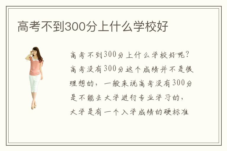 高考不到300分上什么學(xué)校好呢?高考沒有300分這個(gè)成績(jī)并不是很理想的,一般來說高考沒有300分是不能去大學(xué)進(jìn)行專業(yè)學(xué)習(xí)的,大學(xué)是有一個(gè)入學(xué)成績(jī)的硬標(biāo)準(zhǔn)的,因此高考不到300分也就不能上大學(xué)了。那么,高考不到300分上什么學(xué)校好呢?現(xiàn)在有很多大專技術(shù)培訓(xùn)學(xué)校成立起來,這些大專技術(shù)培訓(xùn)學(xué)校通常是高考落榜學(xué)生們進(jìn)行專業(yè)學(xué)習(xí)的平臺(tái),因此高考不到300分可以上大專。