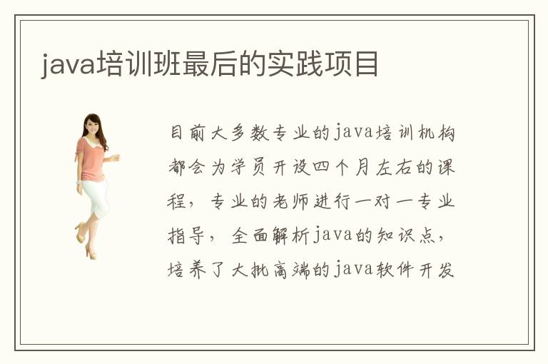 目前大多數(shù)專業(yè)的java培訓機構都會為學員開設四個月左右的課程,專業(yè)的老師進行一對一專業(yè)指導,全面解析java的知識點,培養(yǎng)了大批高端的java軟件開發(fā)設計工程師。專業(yè)的java培訓機構會從基礎給學生講起,牢牢扎實基礎,循序漸進。為不同基礎的學員開設不同程度的培訓班,有基礎班和提升班之分。那么,java培訓班最后的實踐項目是什么呢?