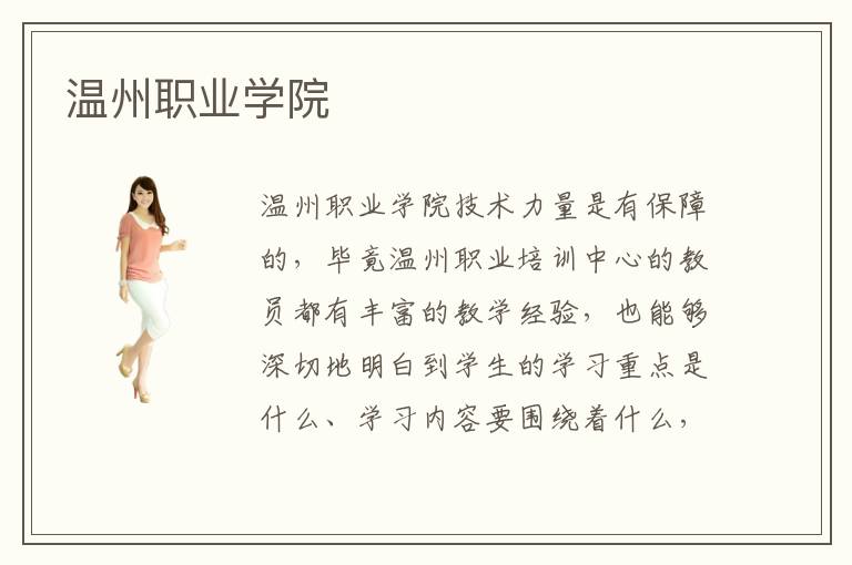 溫州職業(yè)學(xué)院技術(shù)力量是有保障的,畢竟溫州職業(yè)培訓(xùn)中心的教員都有豐富的教學(xué)經(jīng)驗,也能夠深切地明白到學(xué)生的學(xué)習(xí)重點是什么、學(xué)習(xí)內(nèi)容要圍繞著什么,給了學(xué)生們一個學(xué)習(xí)的大致方向。溫州職業(yè)技術(shù)學(xué)校一方面努力把學(xué)生們的專業(yè)水準提高一個新的平臺,另一方面也努力把學(xué)校自身打造專屬平臺。溫州職業(yè)技術(shù)培訓(xùn)機構(gòu)排名比較是要根據(jù)多方面的綜合實力來考察的。