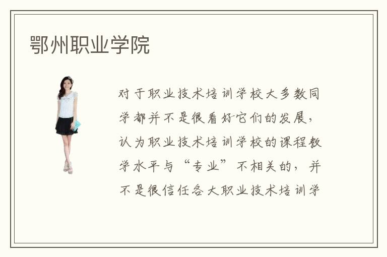對于職業(yè)技術(shù)培訓(xùn)學(xué)校大多數(shù)同學(xué)都并不是很看好它們的發(fā)展,認(rèn)為職業(yè)技術(shù)培訓(xùn)學(xué)校的課程教學(xué)水平與“專業(yè)”不相關(guān)的,并不是很信任各大職業(yè)技術(shù)培訓(xùn)學(xué)校的教學(xué)質(zhì)量。一般情況下,大家對于職業(yè)技術(shù)培訓(xùn)學(xué)校的評價都不是很好,那么同學(xué)們對于鄂州職業(yè)學(xué)院的評價是怎樣的呢?鄂州職業(yè)學(xué)院在廣大市民心目中是不是一所比較靠譜的專業(yè)技術(shù)培訓(xùn)學(xué)校呢?