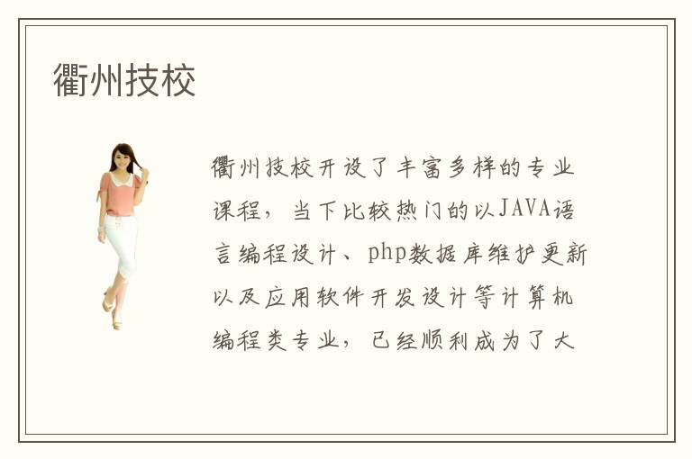 衢州技校開設了豐富多樣的專業(yè)課程,當下比較熱門的以JAVA語言編程設計、php數(shù)據(jù)庫維護更新以及應用軟件開發(fā)設計等計算機編程類專業(yè),已經(jīng)順利成為了大家在衢州技校選擇的熱門專業(yè)。衢州技校開設了眾多專業(yè)課程的同時,給學員們提供了更多選擇的機會,也能使得越來越多的同學根據(jù)自己的興趣愛好所在進行合理的專業(yè)選擇,從而選擇適合該專業(yè)學習的相關(guān)課程。