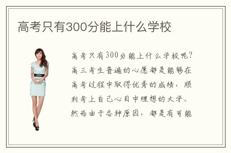 高考只有300分能上什么學(xué)校呢?高三考生普遍的心愿都是能夠在高考過程中取得優(yōu)秀的成績,順利考上自己心目中理想的大學(xué)。然而由于各種原因,都是有可能會導(dǎo)致高考落榜的,高考落榜的打擊對大家是很大的。在高考過程中落榜的同學(xué)也可以選擇一些比較靠譜的大專技術(shù)培訓(xùn)學(xué)校進行學(xué)習(xí),盡快的掌握一門專業(yè)技術(shù)這也是高考落榜生對于其他大學(xué)生來說,具有的一定優(yōu)勢。