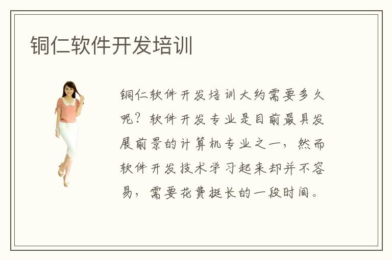 銅仁軟件開發(fā)培訓大約需要多久呢?軟件開發(fā)專業(yè)是目前最具發(fā)展前景的計算機專業(yè)之一,然而軟件開發(fā)技術(shù)學習起來卻并不容易,需要花費挺長的一段時間。每個人對于知識的接受能力不同,自然學好這門專業(yè)的時間也會不同。那么,怎樣才能又快又好的學習呢?進入專業(yè)的銅仁軟件開發(fā)培訓就是最好的方式,銅仁軟件開發(fā)培訓有最專業(yè)的團隊教學,一般培訓4個月左右就可以順利畢業(yè)。