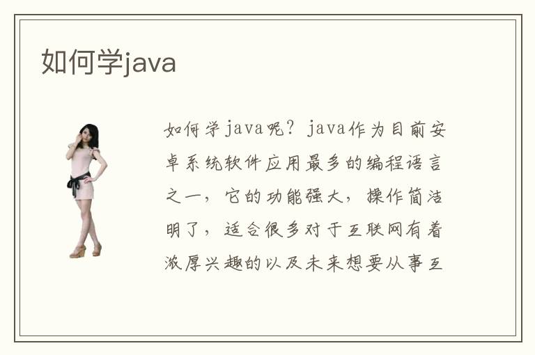 如何學(xué)java呢?java作為目前安卓系統(tǒng)軟件應(yīng)用最多的編程語言之一,它的功能強大,操作簡潔明了,適合很多對于互聯(lián)網(wǎng)有著濃厚興趣的以及未來想要從事互聯(lián)網(wǎng)職業(yè)的人學(xué)習(xí)的首選。學(xué)習(xí)java專業(yè)是一個枯燥的過程,需要大家耐下心來,也要學(xué)會堅持,要踏踏實實的從基礎(chǔ)語法開始練習(xí),逐漸開發(fā)設(shè)計一些小型的應(yīng)用軟件,這些都能給你豐富的實踐操作經(jīng)驗。