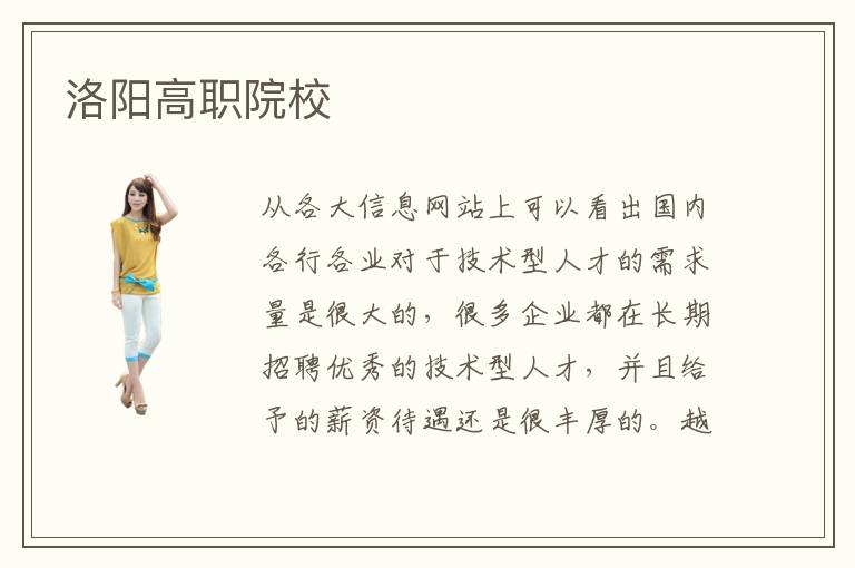從各大信息網(wǎng)站上可以看出國內(nèi)各行各業(yè)對于技術型人才的需求量是很大的,很多企業(yè)都在長期招聘優(yōu)秀的技術型人才,并且給予的薪資待遇還是很豐厚的。越來越多的專業(yè)洛陽高職院校出現(xiàn)在大家面前,那么,這些洛陽高職院校成立的主要目的是什么嗎?洛陽高職院校成立的目標就是為洛陽市各行各業(yè)培養(yǎng)更多優(yōu)秀的技術型人才,也正在為完成這一目標而奮斗努力。