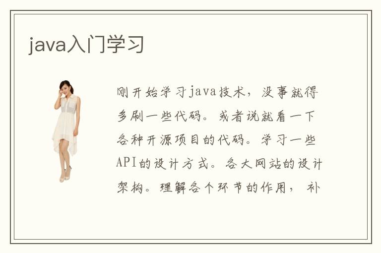 剛開始學習java技術,沒事就得多刷一些代碼。或者說就看一下各種開源項目的代碼。學習一些API的設計方式。各大網(wǎng)站的設計架構。理解各個環(huán)節(jié)的作用, 補充自己的知識庫存。java入門學習內(nèi)容有,java簡介,就是了解什么是java,代碼語法基本格式,輸出表達式。了解java大致的編譯以及執(zhí)行過程。java語言基礎,循環(huán),數(shù)組,了解類和對象,掌握java的基本數(shù)據(jù)類型和引用數(shù)據(jù)類型有哪些, 掌握強制數(shù)據(jù)類型轉(zhuǎn)換和自動類型提升規(guī)則。常量如何聲明及賦值,循環(huán)的語法及作用。數(shù)組的聲明及定義。掌握類的概念以及什么是對象等等,這些,基礎知識掌握之后就完成了java入門學習。接下來就可以進一步學習難度較高的一些知識內(nèi)容。