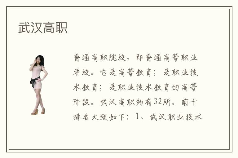 普通高職院校,即普通高等職業(yè)學校。它是高等教育;是職業(yè)技術教育;是職業(yè)技術教育的高等階段。武漢高職約有32所。前十排名大致如下:1、武漢職業(yè)技術學院2、武漢外語外事職業(yè)學院3、武漢紡織大學外經(jīng)貿(mào)學院4、武漢航海職業(yè)技術學院5、武漢民政職業(yè)學6、武漢交通職業(yè)學院7、長江職業(yè)學院8、武漢軟件職業(yè)學院9、武漢語言文化職業(yè)學院10、武漢電力職業(yè)技術學院。當我們選擇武漢高職時,需要考慮的不僅僅是學校排名,同時我們要考慮的因素還有很多,列如,父母期許,專業(yè)興趣,學校規(guī)模,就業(yè)前景,學習氛圍等諸多方面的因素。有些人說,讀了武漢高職是放棄了未來,這是極其錯誤的,要相信,天生我材必有用,常說學好數(shù)理化,走遍天下都不怕,三百六十行,行行出狀元,無論何時何地,只有掌握了實用的技術,都會有前途。武漢高職也能讓我們?yōu)槲磥碜呱仙鐣蛳铝己玫幕A。