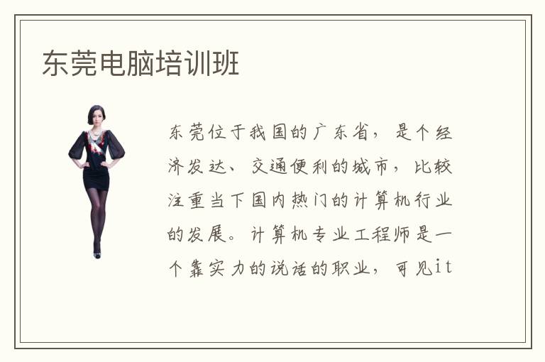 東莞位于我國(guó)的廣東省,是個(gè)經(jīng)濟(jì)發(fā)達(dá)、交通便利的城市,比較注重當(dāng)下國(guó)內(nèi)熱門的計(jì)算機(jī)行業(yè)的發(fā)展。計(jì)算機(jī)專業(yè)工程師是一個(gè)靠實(shí)力的說(shuō)話的職業(yè),可見it技能對(duì)于一名優(yōu)秀的計(jì)算機(jī)程序員來(lái)說(shuō)是很重要的,因此不斷提升自己的計(jì)算機(jī)專業(yè)技術(shù)能力,是一名優(yōu)秀的計(jì)算機(jī)專業(yè)工程師必備的素質(zhì)。東莞電腦培訓(xùn)班是一個(gè)可以與時(shí)俱進(jìn)的提升自己的計(jì)算機(jī)專業(yè)技能的平臺(tái)。