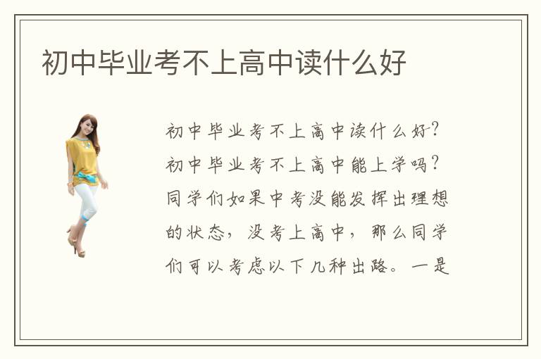 初中畢業(yè)考不上高中讀什么好?初中畢業(yè)考不上高中能上學(xué)嗎?同學(xué)們?nèi)绻锌紱](méi)能發(fā)揮出理想的狀態(tài),沒(méi)考上高中,那么同學(xué)們可以考慮以下幾種出路。一是復(fù)讀初三,然后再參加一次中考。這個(gè)方式比較適用于一次發(fā)揮失常的同學(xué),如果本身成績(jī)就很差,即使復(fù)讀一年效果也不會(huì)明顯。二是讀職業(yè)高中。應(yīng)屆初中畢業(yè)生正好可以就讀職業(yè)高中。三是讀中專(zhuān)學(xué)校。中專(zhuān)學(xué)校的優(yōu)勢(shì)在于入學(xué)門(mén)檻低。四是選擇技工學(xué)校。技工學(xué)校則主要培養(yǎng)職業(yè)技術(shù)人員為主。初中畢業(yè)考不上高中讀什么專(zhuān)業(yè)?在專(zhuān)業(yè)選擇上,同學(xué)們應(yīng)該優(yōu)先考慮熱門(mén)行業(yè)。優(yōu)點(diǎn)在于好就業(yè)、且薪資待遇優(yōu)厚。目前比較熱門(mén)的專(zhuān)業(yè)有、計(jì)算機(jī)專(zhuān)業(yè)、醫(yī)藥衛(wèi)生專(zhuān)業(yè)、中醫(yī)保健專(zhuān)業(yè)、藝術(shù)設(shè)計(jì)專(zhuān)業(yè)、外語(yǔ)專(zhuān)業(yè)、電子商務(wù)專(zhuān)業(yè)、財(cái)會(huì)專(zhuān)業(yè)、旅游專(zhuān)業(yè)等等,都是不錯(cuò)的選擇。