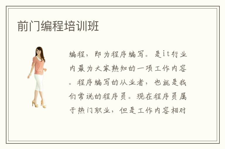 編程,即為程序編寫。是it行業(yè)內(nèi)最為大家熟知的一項工作內(nèi)容。程序編寫的從業(yè)者,也就是我們常說的程序員?,F(xiàn)在程序員屬于熱門職業(yè),但是工作內(nèi)容相對枯燥乏味,整日對著電腦,在鍵盤上敲敲打打。雖然工作辛苦,但是在薪酬待遇方面還是不錯的。目前一線城市的it從業(yè)者普遍的薪資都可以達到六千元以上。從業(yè)經(jīng)驗豐富者,那么月入幾萬都是很正常的事。并且工作中如果成績優(yōu)異,晉升的空間也非常大??傊?,it行業(yè)是一個不錯的就業(yè)方向。前門編程培訓班,前門附近編程培訓班。前門作為北京市內(nèi)繁華地段,附近自然有各種教育機構(gòu),培訓內(nèi)容包含了各種行業(yè),自然有專業(yè)從事it教育的培訓機構(gòu)。在前門附近地區(qū)至少有十幾家從事it教育的培訓班。在選擇的時候,同學們一定要多多用心。其實正規(guī)的教育機構(gòu)的教學水平都是有保證的,只是對教學內(nèi)容等細節(jié)方面問題,同學們最好自己實地感受一下,畢竟只看宣傳與網(wǎng)上的評論是難以對培訓機構(gòu)的整體環(huán)境做到一個客觀實際的了解。前門附近編程培訓班收費。每家培訓機構(gòu)的收費標準都是不同的,并且還要根據(jù)課程內(nèi)容來決定,所以沒法具體回答。