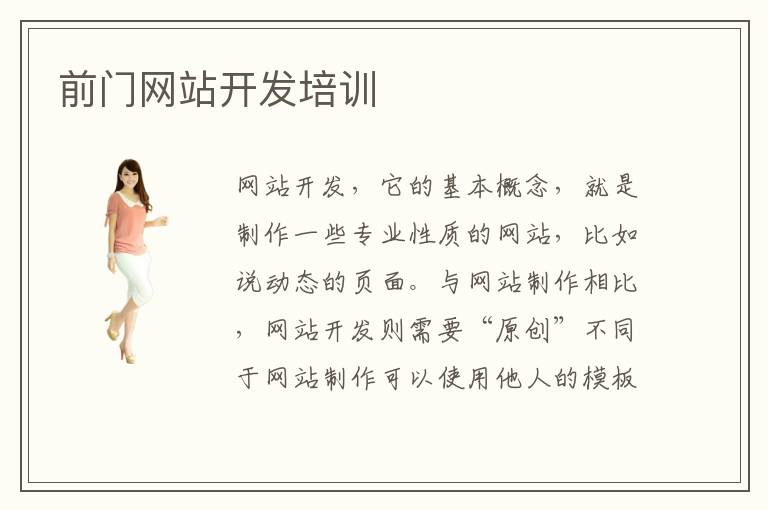 網(wǎng)站開發(fā),它的基本概念,就是制作一些專業(yè)性質(zhì)的網(wǎng)站,比如說動態(tài)的頁面。與網(wǎng)站制作相比,網(wǎng)站開發(fā)則需要“原創(chuàng)”不同于網(wǎng)站制作可以使用他人的模板。根據(jù)字面意思的理解,網(wǎng)站開發(fā)就比網(wǎng)站制作更深入一個層次。實際上,網(wǎng)站開發(fā)確實比網(wǎng)站制作要復雜的多,它不僅是頁面的美工以及內(nèi)容,還涉及到域名查詢與注冊,以及網(wǎng)站功能的開發(fā)等等方面。在比較大型的企業(yè)內(nèi),網(wǎng)站開發(fā)團隊是由數(shù)百位web開發(fā)者組成。網(wǎng)站開發(fā)行業(yè)目前正在處于不斷增長的發(fā)展趨勢,想要獲得網(wǎng)站開發(fā)工程師的職稱,最好到相關(guān)的職業(yè)it教育機構(gòu)進修學習。前門網(wǎng)站開發(fā)培訓,前門附近有多家專業(yè)從事it職業(yè)教育的機構(gòu),可以幫助同學們解決專業(yè)上的問題。前門知名網(wǎng)站開發(fā)培訓機構(gòu)。在前門附近地段的it職業(yè)教育機構(gòu)中,在網(wǎng)絡(luò)搜索中比較知名的就屬北大青鳥,它是一家專業(yè)從事IT培訓的學校,也是一家全國連鎖的教育機構(gòu),教學實力比較雄厚。同學們可以去實地了解一下。