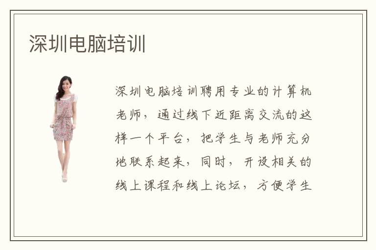 深圳電腦培訓(xùn)聘用專業(yè)的計算機(jī)老師,通過線下近距離交流的這樣一個平臺,把學(xué)生與老師充分地聯(lián)系起來,同時,開設(shè)相關(guān)的線上課程和線上論壇,方便學(xué)生更好更充實(shí)能夠隨時隨地地學(xué)習(xí)。深圳計算機(jī)訓(xùn)練效果如?深圳計算機(jī)培訓(xùn)班在近年來的開設(shè)中,取得了不錯的口碑情況和訓(xùn)練成果,學(xué)生能夠真正的在IT培訓(xùn)機(jī)構(gòu)中學(xué)到實(shí)用性知識。如何正確挑選深圳的計算機(jī)培訓(xùn)學(xué)校呢?