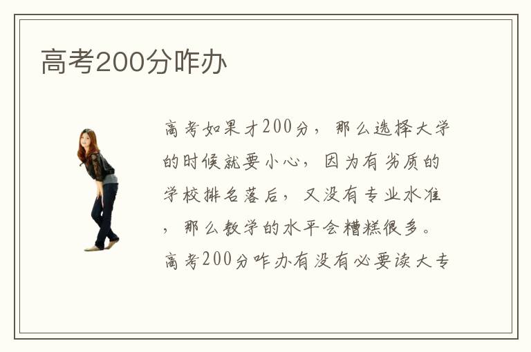 高考如果才200分,那么選擇大學(xué)的時候就要小心,因為有劣質(zhì)的學(xué)校排名落后,又沒有專業(yè)水準(zhǔn),那么教學(xué)的水平會糟糕很多。高考200分咋辦有沒有必要讀大專,有些人可能覺得排名落后,那么大專完全沒有必要多,其實也要看個人的選擇。如果剛高中畢業(yè)就到社會工作,很容易被騙,又沒有歷練,沒有文憑,其實找工作是相當(dāng)困難的,所以大家要盡可能找好學(xué)校。高考200分咋辦怎么調(diào)整自己的出路,高考200分其實也不是沒有出路的,相反有很多大專的院校可以供學(xué)生進(jìn)行選擇,有些大專院??梢赃M(jìn)行專升本,還可以考公務(wù)員,大家可以多多關(guān)注。大專院校其實是更加注重實踐和應(yīng)用,如果覺得自己的的分?jǐn)?shù)不是特別高,或者是專業(yè)優(yōu)勢不太明顯,那么就要更加注重實踐,這樣才能夠適應(yīng)于企業(yè)的需求。